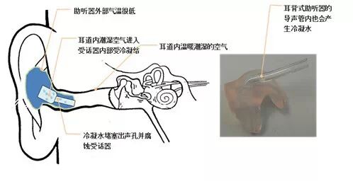 耳背式助听器的耳模声管内产生冷凝水是可见的,但耳内机内的冷凝水出现在内部是看不到的,等到耳内机出现故障时再处理已经晚了,因此平时的防潮工作非常重要: